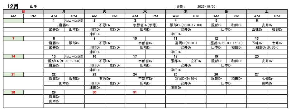 山本医師 12月8日(月)、12月12日(金) 午後休診