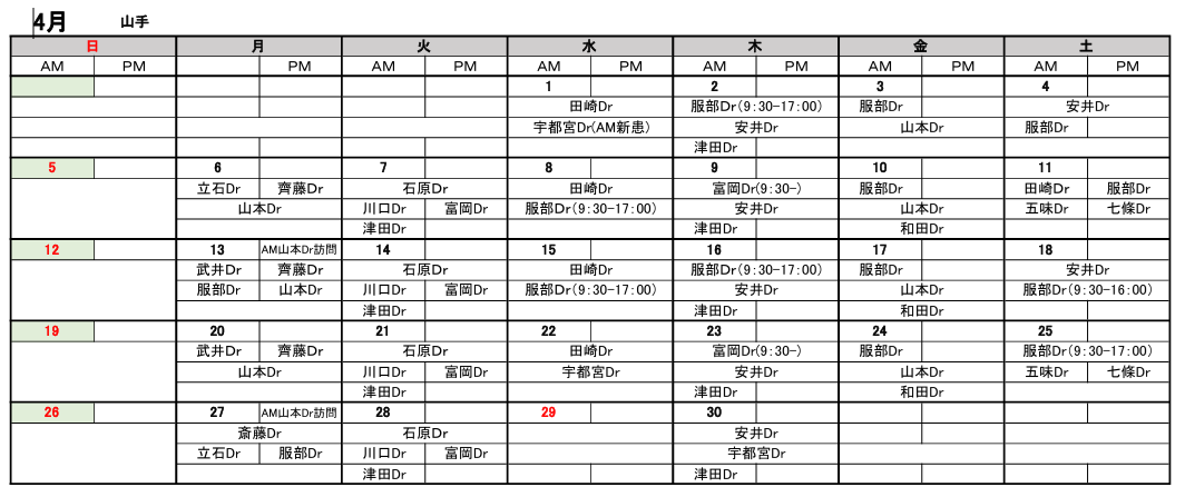 4月より担当医の勤務変更がいくつかございますのでご予約の際はご注意ください。